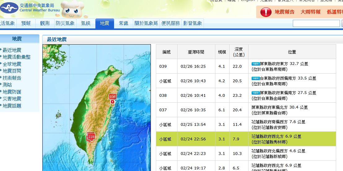 搖晃才結束沒多久,還沒確定是否是自己神經過敏,第二次搖晃又來,這次很確定是地震,趕快打開 plurk 果然上面已經有地震噗,在打開中央氣象局網站,裡面記錄了三個地震記錄,一直到晚上6:30,屏東地區已經發生3次規模4以上地震,在附近的台東也發生一次規模4.2的地震。